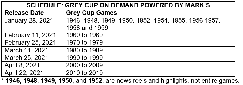 Below is the publishing schedule for the Grey Cup On Demand Portal powered by Mark’s. New games will be released every two weeks between January 28th to April 22nd.