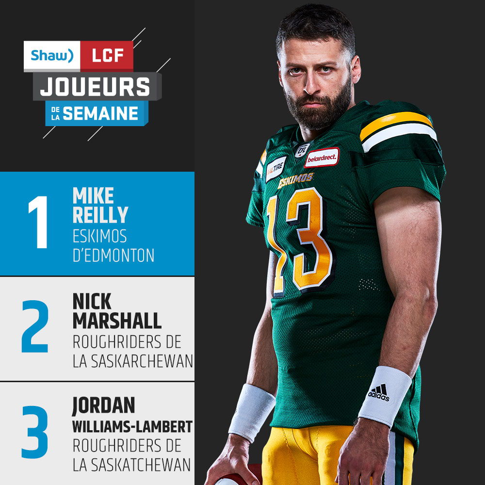 TORONTO – Mike Reilly, Nick Marshall et Jordan Williams-Lambert ont été nommés joueurs de la semaine, présentés par Shaw, à la suite de la dixième semaine d’activités de la saison 2018 de la Ligue canadienne de football (LCF).