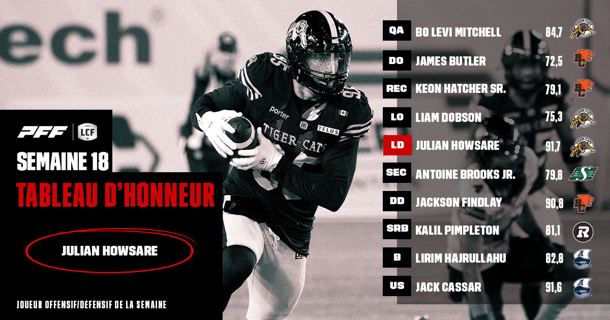 TORONTO (7 octobre 2025) – Julian Howsare, Bo Levi Mitchell et la ligne offensive des Tiger-Cats de Hamilton ont obtenu les meilleures notes de la semaine 18 dans le tableau d’honneur de la Ligue canadienne de football (LCF), alimenté par Pro Football Focus (PFF).