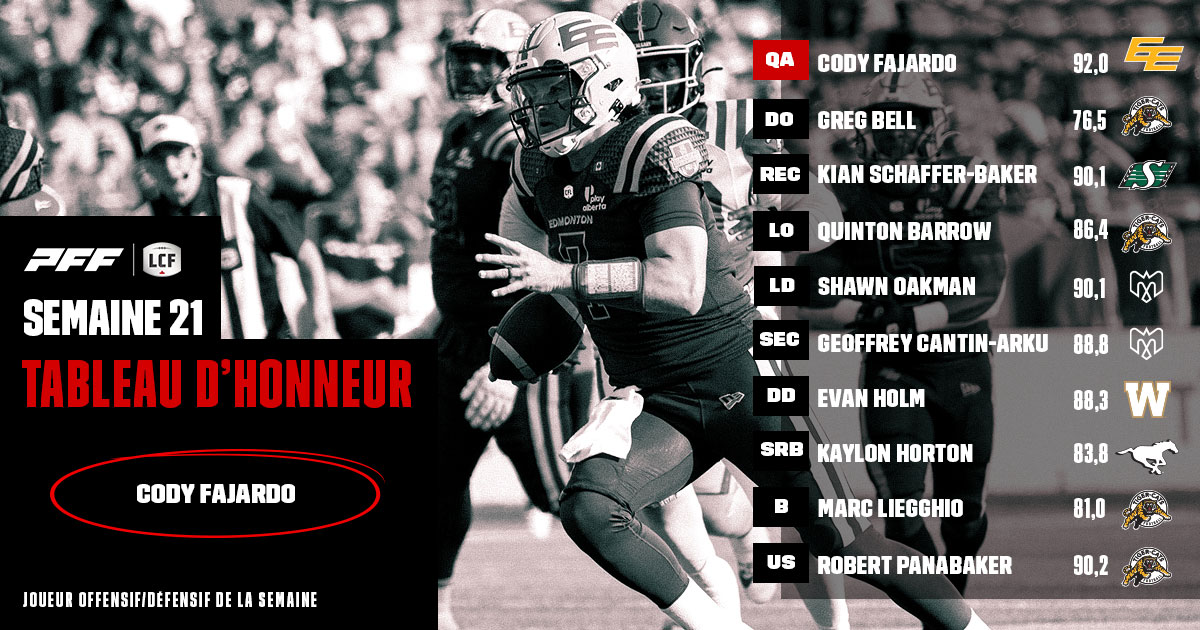 TORONTO (28 octobre 2025) – Cody Fajardo, Shawn Oakman et la ligne offensive du ROUGE et NOIR d’Ottawa ont obtenu les meilleures notes de la semaine 21 dans le tableau d’honneur de la Ligue canadienne de football (LCF), alimenté par Pro Football Focus (PFF).
